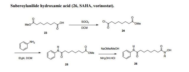 Vorinostat was first described in US patent 5369108, wherein four different synthetic routes for the preparation of vorinostat are disclosed (Schemes 1 to 4).