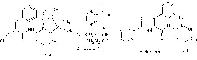 EP0788360 B1 describes a general process for preparation of amino boronic acid and ester compounds using (1 S, 2S, 3R, 5S)-pinanediol leucine boronate and an amino acid or its derivative as starting materials. As coupling agents 1-ethyl-3-(3-dimethylamino-propyl)carbodiimide hydrochloride (EDC), benzotriazol-1-yloxytris (dimethylamino) phosphonium hexafluorophosphate (BOP reagent), or 0-(MH- benzotriazol-1-yl)-/V,/V,/V,/V-tetramethyluronium tetrafluoroborate (TBTU) were employed.