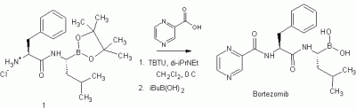 Bortezomib (PS-341, Velcade®; N-(pyrazin-2-yl)carbonyl-L-phenylalanine-L-leucine boronic acid; (1R)-3-Methyl-1-[(2S)-3-phenyl-2-[(pyrazinylcarbonyl)amino]propanoyl]amino]butyl]boronic acid; CAS Registry Number: 179324-69-7) is an N-acylated dipeptide analogue of phenylalanyl-leucine in which a boronic acid functional group replaces the C-terminal carboxylic acid. It is a white to almost white crystalline powder and when appropriately formulated for injection is an anti-neoplastic agent and is a therapeutic proteosome inhibitor. In the US this active pharmaceutical ingredient (API) is approved for the treatment of multiple myeloma and mantle cell lymphoma.