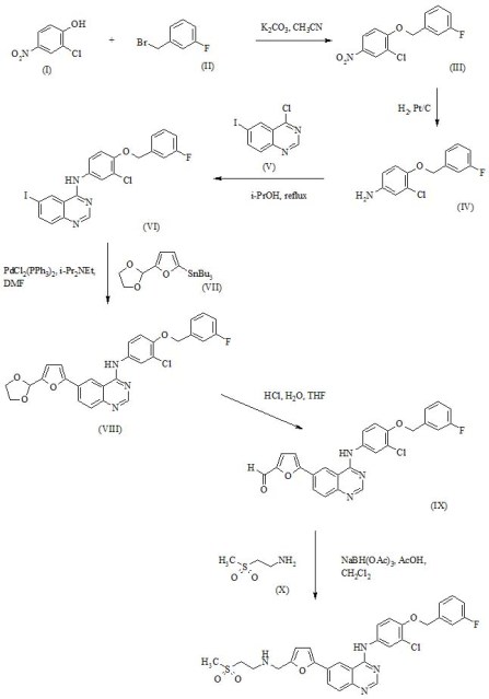 W02005120504A2 (Glaxo, in June 2005 I filed) proposed an alternative approach: a 4 – chloro-6 – iodine quinazoline as the starting material, with 5 – formyl-furan-2 – boric acid instead of highly toxic tin compounds alkylfuryl prepared lapatinib. The synthetic route is as follows: