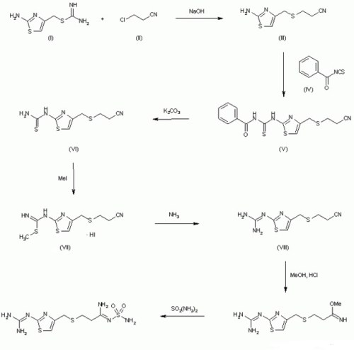 The reaction ot S-(2-aminothiazol-4-ylmethyl)isothiourea (I) with 3-chloropropionitrile (II) by means of NaOH in ethanol – water gives 3-(2-aminothiazol-4-ylmethylthio)propionitrile (III), which is condensed with benzoyl isothiocyanate (IV) in refluxing acetone to afford 3-[2-(3-benzoylthioureido)thiazol-4-ylmethylthio]propionitrile (V). The hydrolysis of (V) with K2CO3 in acetone – methanol – water yields 3-(2-thioureidothiazonl-4-ylmethylthio)propionitrile (VI), which by methylation with methyl iodide in refluxing ethanol is converted into 3-[2-(S-methylisothioureido)thiazol-4-ylmethylthio]propionitrile hydroiodide (VII). The reaction of (VII) with NH3 and NH4Cl in methanol at 90 C in a pressure vessel affords 3-(2-guanidinothiazol-4-ylmethylthio)propionitrile (VIII), which by partial alcoholysis with methanol by means of dry HCl in CHCl3 is converted into methyl 3-(2-guanidinothiazol-4-ylmethylthio)propionimidate (IX). Finally, this compound is treated with sulfamide in refluxing methanol.