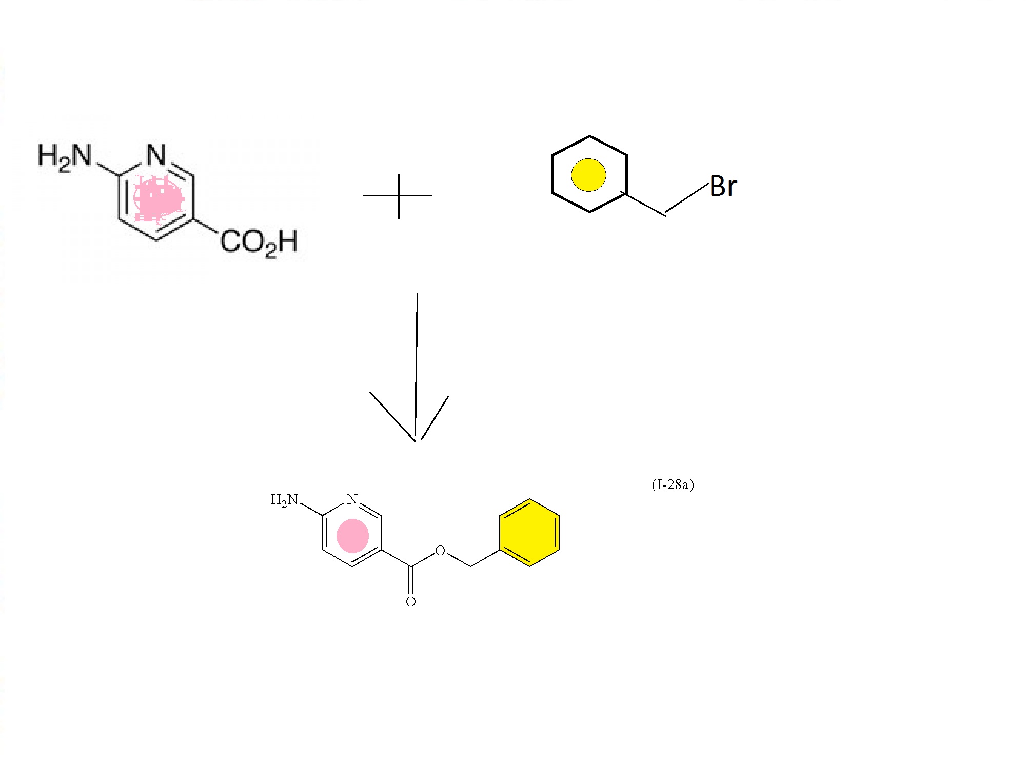 To a stirred suspension of 6-aminonicotinic acid (100 g, 0.72 mol; Aldrich Chemical Company, Inc., Milwaukee, Wis.) in N,N-dimethylformamide (700 mL) with brisk mechanical stirring was added potassium carbonate (150 g, 1.08 mol) and the reaction was stirred for 10 min before the portionwise addition of benzyl bromide (95 mL, 0.80 mol). The reaction was stirred at room temperature overnight, then the solids were filtered off and washed thoroughly with ethyl acetate, and the solvent was removed under vacuum. The filter cake was dissolved in water and extracted with ethyl acetate. The residue after evaporation of N,N-dimethylformamide was combined with the ethyl acetate extracts (total volume 2 L of ethyl acetate) and the combined organic extracts washed with brine (5×500 mL), dried (MgSO4) and the solvent removed under reduced pressure. The crude product was refluxed with 1:1 diethyl ether:hexane for 30 min then the solids filtered off (warm), washed with diethyl ether:hexane (1:1), and dried. This solid was precipitated from hot toluene (hot filtration required to remove dibenzylated material) and dried to afford (I-28a) (107.2 g, 65%) as an off-white solid; 1H NMR (DMSO-d6): δ 8.50 (1H), 7.82 (1H), 7.34-7.29 (5H), 6.84 (2H), 6.43 (1H), 5.23 (2H); m/z 229.4 (M+H)+.