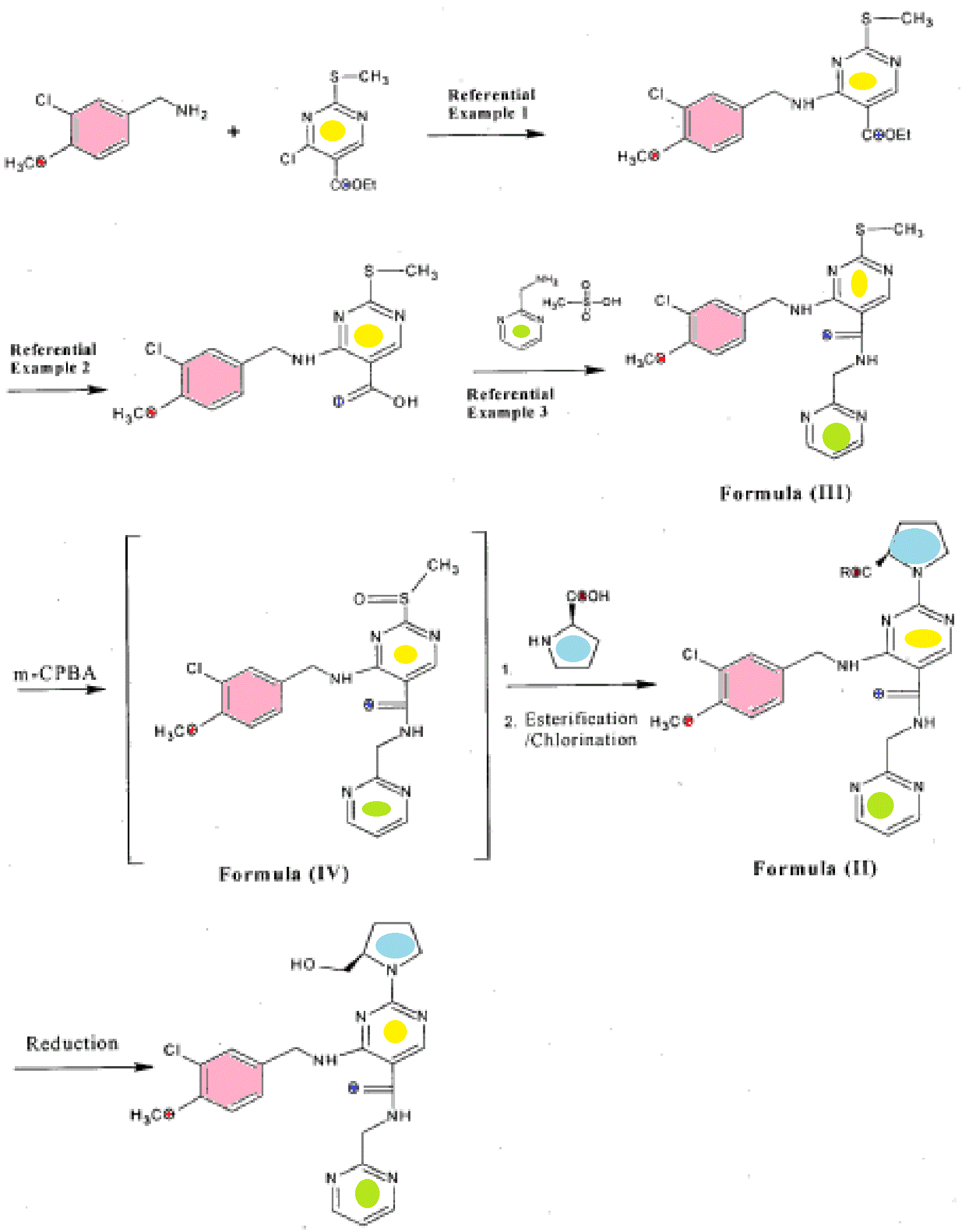 To a mixture of 400ml of toluene and 0.5ml of dimethyl formamide was added 50g of 4-[(3-chloro-4-methoxybenzyl) amino]-2-(methyl sulfanyl) pyrimidine-5-carboxylic acid (Referential Example 2) and 70g of thionyl chloride, and the reaction mixture was refluxed for 2.5 hours. After completion of reaction, solvent was distilled under vacuum and the residue was stripped with toluene to obtain yellow solid mass. The solid mass thus obtained, was cooled to 15-20°C followed by addition of 1 75ml of methylene dichloride, 36. l g of 2-amino methyl pyrimidine mesylate and 35.55g of triaethylamine. The reaction mixture was stirred overnight at 25-30°C. After completion of reaction, methylene dichloride was distilled out to get residue. The residue was washed sequentially with 2.5% sodium carbonate solution and water. The residue was then treated with methanol to obtain 4-[(3-chloro-4-methoxybenzyl) amino]-2-(methyl sulfinyl)-N-(pyrimidin-2-ylmethyl) pyrimidine-5-carboxiamide of Formula (III) having HPLC purity of more than 95% (yield: 80%)