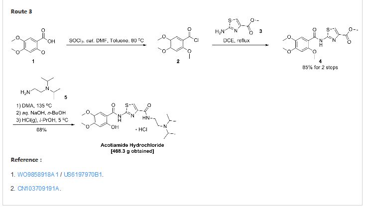 A test for the amine hydrochloride (z-338) Compound Patent Application (CN96194002.6) choosing 2,4,5-trimethoxy benzoic acid as a starting material first with 2-aminothiazol-4-carboxylate reacts 2- [(2-hydroxy-4,5-dimethoxybenzoyl) amino] -1,3-thiazole-4-carboxylate, 2-methyl-benzene and then removed, the yield of this method lower demethylation selectivity bad. So choose the first 2-methyl-removal before subsequent reaction better.