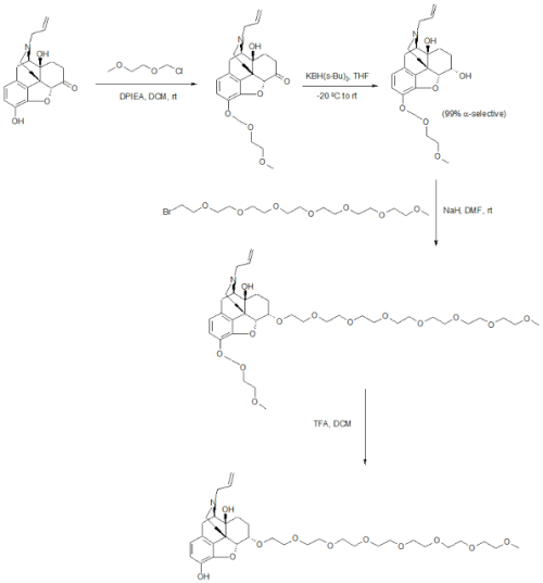 US20050136031A1: The patent reports detailed synthetic procedures to manufacture gram quantities of Naloxegol. The synthesis starts with Naloxone which was treated with methoxyethyl chloride in the presence of Hunig’s base to give the protected ketone. Reduction of the ketone with potassium tri-sec-butylborohydride exclusively provided the α-alcohol in 85% yield. Deprotonation of the alcohol with sodium hydride followed by alkylation with CH3(OCH2CH2)7Br provided the pegylated Naloxone in 88% yield.