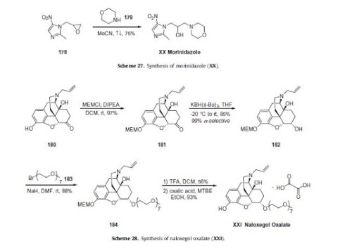 Naloxegol oxalate (XXI) is a peripherally acting l-opioid receptor antagonist that was approved in the USA and EU for the treatment of opioid-induced constipation in adults with chronic non-cancer pain. The drug, a pegylated version of naloxone, has significantly reduced central nervous system (CNS) penetration and works by inhibiting the binding of opioids in the gastrointestinal tract.152–154 Naloxegol oxalate was developed by Nektar and licensed to AstraZeneca. Although we were unable to find a single report in the primary or patent literature that describes the exact experimental procedures to prepare naloxegol oxalate, there havebeen reports on the preparation of closely related analogs155 with specific reports on improving the selectivity of the reduction step156 and the salt formation of the final drug substance.157 Taken together, the likely synthesis of naloxegol oxalate (XXI) is
