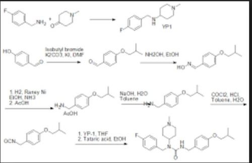 Preparation of N-(4-fluorobenzyl)-N-(1-methylpiperidin-4-yl)-N’-[4-(2-methylpropyloxy)phenylmethyl]carbamide and its tartrate salt and crystalline forms.
