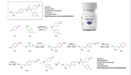 First, reduction of the ketone and a secondary amine to amine condensation after S-3 . 4- hydroxybenzaldehyde etherification, followed by condensation with hydroxylamine to give the oxime S-. 7 , which is then reduced by hydrogenation to the amine S-. 8 , S.8- light gas reaction to give the isocyanate S-. 9 , S. 9- react with the primary amine can be obtained Nuplazid ( pimavanserin ).Kg product can be obtained by this route.