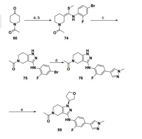 | Example 299 | 1-[3-[2-fluoro-4-(1-methylpyrazol-4- yl)anilino]-1-[(3R)-tetrahydrofuran-3- yl]-6,7-dihydro-4H-pyrazolo[4,3- c]pyridin-5-yl]ethanone![]() |