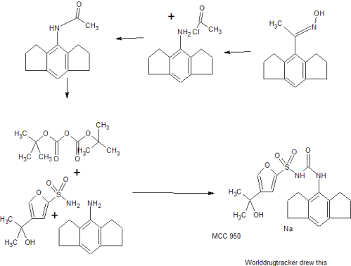 A novel synthesis of the anti-inflammatory agent 1-(1,2,3,5,6,7- hexahydro-s-indacen-4-yl)-3-[4-(1-hydroxy-1-methyl-ethyl)-furan-2-sulfonyl] urea 1 is described. Sulfonamide 5 was prepared starting from ethyl 3-furoate 2. Key steps were a one-pot sulfonylation with chlorosulfonic acid in methylene chloride followed by pyridinium salt formation and reaction with phosphorus pentachloride to provide ethyl 2-(chlorosulfonyl)-4-furoate 7. This sulfonyl chloride was treated with ammonium bicarbonate to form sulfonamide 8, followed by treatment with excess methyl magnesium chloride to provide 4-(1-hydroxy-1-methyl-ethyl)-furan-2-sulfonamide 5. 4-Isocyanato-1,2,3,5,6,7-hexahydro-s-indacene 16 was prepared from indan in five steps. The formation of the desired sulfonyl urea was carried out both with the isolated isocyanate 16 and via an in situ method.