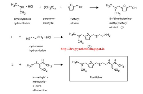 The reaction of 5-dimethylaminomethyl-2-furanylmethanol (I) with 2-mercaptoethylamine (II) by means of aqueous HCl gives 2-[[(5-dimethylamino-methyl-2-furanyl)methylthio]ethaneamine (III), which is then condensed with N-methyl-1-methylthio-2-nitrotheneamine (IV) by heating at 120 C. Compound (IV) is obtained by reaction of 1,1-bis(methylthio)-2-nitroethene (V) with methylamine in refluxing ethanol