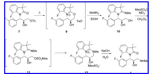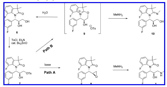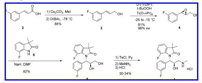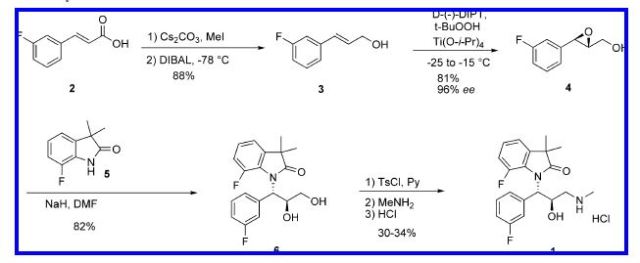 Sharpless epoxidation of fluorocinnamic alcohol 3 which selectively introduced both relative and absolute configurations at the C-2 and C-3 positions. At the early stages of the project, allylic alcohol 3 was prepared in two steps from commercially available fluorocinnamic acid 2 by treatment with MeI in the presence of Cs2CO3 in acetone, followed by DIBAL reduction at -78 °C. The epoxide 4 was opened with the sodium salt of dimethylfluoroindolinone in DMF to afford the diol. The diol 6 was further elaborated into the final aminoalcohol hydrochloride 1 in 30-34% yield via tosylation with p-toluenesulfonyl chloride (TsCl) in pyridine, isolation of the intermediate monotosylate, treatment with MeNH2, and conversion to HCl salt. Dimethylfluoroindolinone was prepared by reduction and bis-methylation of 7-fluoroisatin by a process developed earlier as described in a prior publication.3