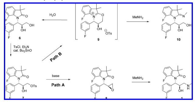 Use of LiHMDS as a base and Ti(O-i-Pr)4 as a Lewis acid was optimal for efficient and reproducible addition of indolinone anion to epoxyalcohol. Conversion of indolinone diol to indolinone aminoalcohol was achieved via monotosylationmethylamination.