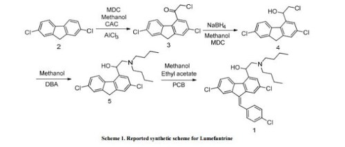 Bansi, Lal; Genbhau, Gund Vitthal; Prabhakar, Bapat Chintamani; Popat, Bochiya Pravin; Banshi, Punde Dnyanadeo; Venkata, Reddy Prabhakar Gorla. Improved one pot process for the synthesis of lumefantrine. Assignee Calyx Chemicals and Pharmaceuticals Ltd., India. IN 2009MU01437. (2010).