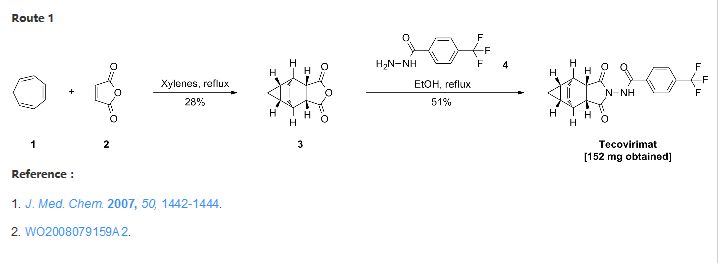 The first synthesis of tecovirimat was published in a patent filed by scientists at Siga Technologies in 2004. It is made in two steps from cycloheptatriene.[17]