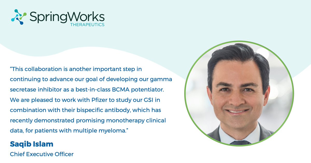 Saqib Islam, Chief Executive Officer of SpringWorks Therapeutics Said: This collaboration is another important step in continuing to advance our goal of developing nirogacestat as a best-in-class BCMA potentiator, and we are pleased to work with Pfizer to study nirogacestat in combination with PF‐06863135, which has recently demonstrated promising monotherapy clinical data, We now have five collaborations with industry-leading BCMA developers to evaluate nirogacestat in combinations across modalities. We look forward to generating clinical data with our collaborators to further evaluate the ability of nirogacestat to improve outcomes for patients with multiple myeloma.