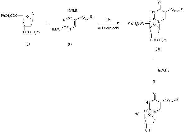 he condensation of 2-deoxy-3,5-di-O-(phenylacetyl)-beta-D-erythro-pentofuranosyl chloride (I) with 2,4-bis-O-(trimethylsilyl)-5(E)-(2-bromovinyl)uracil (II) in acetonitrile (Lewis acid catalyst), or in CHCl3-pyridine (Bronsted acid catalyst), gives 3′,5′-di-O-(phenylacetyl)-5(E)-(2-bromovinyl)-2′-deoxyuridine (III) and its anomer that is eliminated by TLC (silicagel). Finally, (III) is treated with sodium methoxide in methanol.