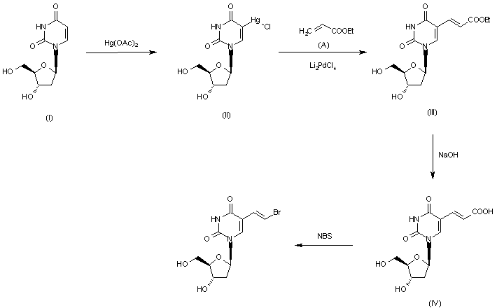 5-Chloromercuri-2′-deoxyuridine (II) is prepared from 2′-deoxyuridine (I) by reaction with mercuriacetate and natrium chloride (1). Condensation of (II) with ethylacrylate (A) and lithium palladium chloride gives (E)-5-(2-carbethoxyvinyl)-2′-deoxyuridine (III), which is readily hydrozyled to (E)-5-(2-carboxyvinyl)-2′-deoxyuridine (IV) under basic conditions (0.5M NaOH). The final step involves the reaction of (IV) with N-bromosuccinimide to produce (E)-5-(2-bromovinyl)-2′-deoxyuridine.