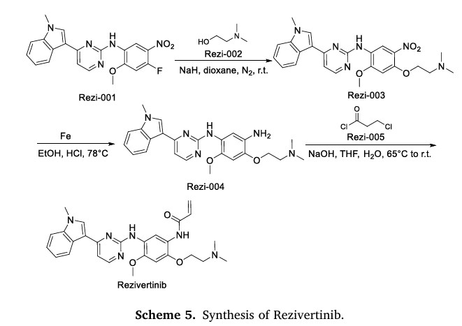 The synthesis of Rezivertinib, illustrated in Scheme 5, initiates with nucleophilic substitution reaction between Rezi-001 and Rezi-002,affording Rezi-003 [23]. Fe-mediated reduction of Rezi-003 yields