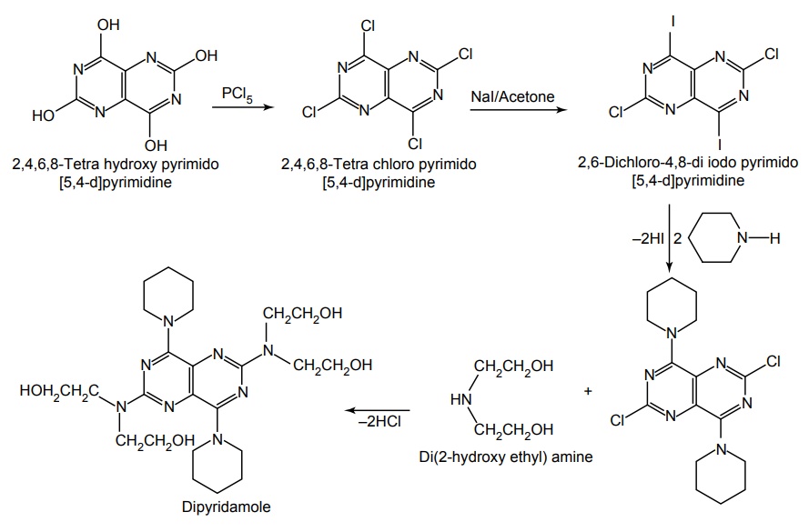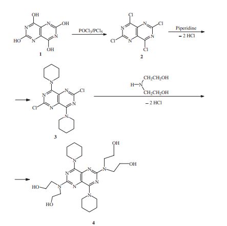 clipA general outline of the procedure for synthesizing dipyridamole is shown in Scheme 1. Reaction of the pyrimidino pyrimidine-2,4,6,8- tetraol (1) with a mixture of phosphorous oxychloride and phosphorous pentachloride gives the tetrachloro derivative (2). The halogens at the peri positions 4 and 8 are more reactive to substitution than are the remaining halogen pairs 2 and 6, which are in effect the two positions of the pyrimidines. Thus, reaction with piperidine at ambient temperature gives the 4, 8 diamine (3). Subsequent reaction with bis-2-hydroxy ethylamine under more strenuous conditions gives dipyridamole (4) [12, 13].12. F.G. Fischer, J. Roch, and A. Kottler, U.S. Patent 3, 031, 450 (1962). 13. D. Lednicer and L.A. Mitscher, The Organic Chemistry of Drug Synthessis Volume 1, John Wiley and Sons, New York, p. 428 (1977).