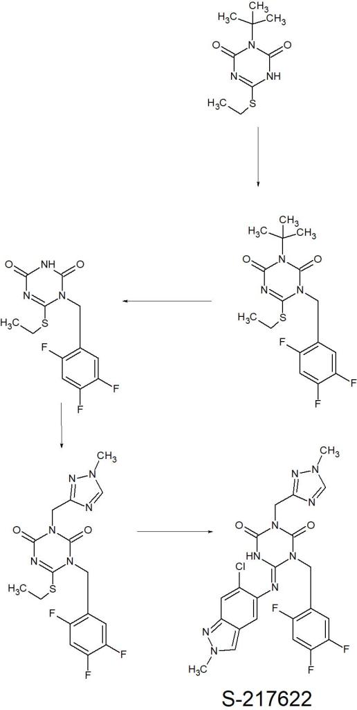 - ^ Jump up to:a b Unoh Y, Uehara S, Nakahara K, Nobori H, Yamatsu Y, Yamamoto S, et al. (January 2022). “Discovery of S-217622, a Non-Covalent Oral SARS-CoV-2 3CL Protease Inhibitor Clinical Candidate for Treating COVID-19”. bioRxiv. doi:10.1101/2022.01.26.477782. S2CID 246367525.