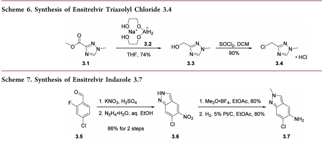 A convergent, kilogram-scale synthesis of ensitrelvir suitable for manufacturing has been described in the literature by researchers at Shionogi. 30 The synthetic approach involved the union of two key building blocks indazole 3.7 and 1,3,5triazinone 3.14, each necessitating development of a scale worthy route. The preparation of triazinone 3.14 necessitated construction of a triazolyl methylene chloride subunit which