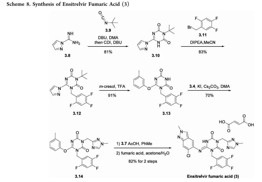 block 3.7 in the presence of anhydrous acetic acid. Isolation of ensitrelvir fumaric acid was achieved by exposure to fumaric acid in aqueous acetone.