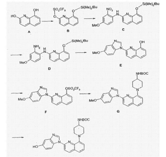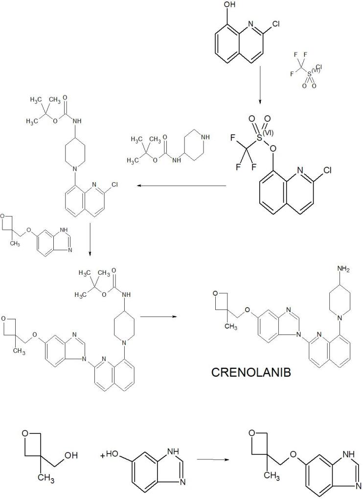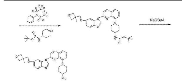 authors report that m-cresol was identified as a leaving group that facilitated introduction of indazole 3.7 with a minimal number of byproducts in a later step of the synthesis. The TFA-mediated reaction concomitantly removed the N-tertbutyl group providing compound 3.13 in 91% yield. Nalkylation with chloride 3.4 in the presence of a base resulted in intermediate 3.14 which was then treated with building