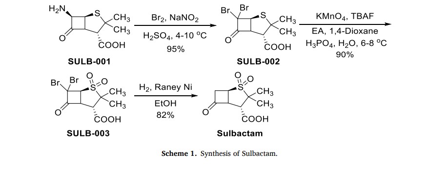in the presence of sulfuric acid. Then, SULB-002 was oxidized by potassium permanganate to obtain sulfone SULB-003. Finally, the sulfonewas catalytically hydrogenated and dehalogenated in the presence of Raney nickel to get Sulbactam