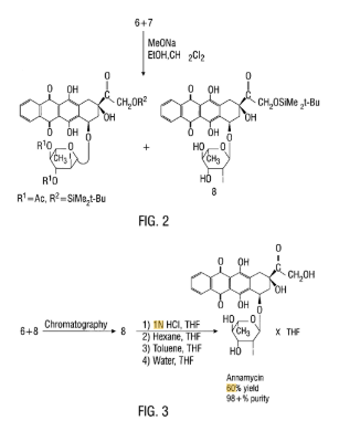 Crude product was purified further by triple precipitation from THF. To accomplish this, approximately 87 mL of THF was used to redissolve each gram of Annamycin product and an equal volume of one of the following solvents was added to precipitate the Annamycin in each successive precipitation step. In the preferred method, the first precipitation was accomplished by adding an equal volume of a 7:3 mixture of hexane\diethylether, the second precipitation was accomplished by the addition of an equal volume of hexane, and the third precipitation was by addition of an equal volume of water and evaporation of half of the THF. Product obtained in this way (9.0146 g; 59%) was a complex containing 3 molecules of Annamycin per 2 molecules of THF and its purity by HPLC analysis was better than 98%. HPLC analysis was on an analytical C-18 reverse phase column with increasing concentrations of methanol/acetonitrile in water. The purity was determined by measuring the area of the absorbance peaks. 1 H NMR (DMSO-d6) d 1.20 (d, 3H, J6′, 5′ =6.2 Hz, H-6′), 1.75 (m, 2.7H, Ha from THF), 2.10 (dd, 1H, J8a,7 =5.6 Hz, J8a,8e =14.5 Hz, H-8a), 2.18 (dd, 1H, J8e,8a =14.8 Hz, J8e,7 =2.9 Hz, H-8e), 250 (DMSO peak), 2.75 (dd, 1H, J3′,2′ =3.9 Hz, J3′,4′ =8.8 Hz, H-3′), 2.95 (d, 1H, J10a,10e =18.4 Hz, H-10a), 3.00 (d, 1H, J10e,10a =18.4 Hz, H-10e), 3.20 (t, 1H, SJ=18.1 Hz, H-4′), 3.59 (m, 2.7H, Hb from THF), 3.95 (m, 1H, H-5′), 4.30 (d, 1H, J2′,3′ =4.0 Hz, H-2′), 4.55 (s, 2H, H-14), 4.89 (t, 1H, exchangeable, OH), 4.92 (m, 1H, H-7), 5.18 (d, 1H, exchangeable, OH), 5.38 (d, 1H, exchangeable, OH), 5.49 (s, 1H, H-1′), 5.50 (d, 1H, exchangeable, OH), 7.9, 8.4 (2m, 4H,H-1,2,3,4); 13 C NMR (DMSO-d6) d 17.0(s, 1C, C-6′), 24.5 (s, 1C, THFb), 31.7 (s, 1C, C-2′), 31.9 (s, 1C, C-10), 36.4 (s, 1C, C-8), 63.0 (s, 1C, C-3′), 66.4 (s, 1C, C-5′), 67.4 (s, 1C, THFa), 69.4, 13 C-NMR (DMSO-d6) δ 17.9 (s, 1C, C-6′), 25.1 (s, 1C, THFb), 40.6, 36.6, 32.1 (3s, 3C, C-2′,8,10), 63.6 (s, 1C, C-14), 67.0, 67.5, 70.4, 69.7 (4s, 4C, C-7, 5′, 3′, THFa), 74.2, 74.7 (2s, 2C, C-9, 4′), 104.5 (s, 1C, C-1′), 110.1, 110.8 (2s, 1C, C-11a, 5a), 126.6, 132.6, 132.8, 134.4, 135.1, 135.0, 136.0 (7s, 8C, C-2, 3, 1, 4, 4a, 12a, 10a), 136.0 (s, 1C, C-6a), 155.1, 156.4 (2s, 2C, C-6, 11), 186.2, 186.3 (2s, 2C, C-5, 12), 214 (s, 1C, C-13).