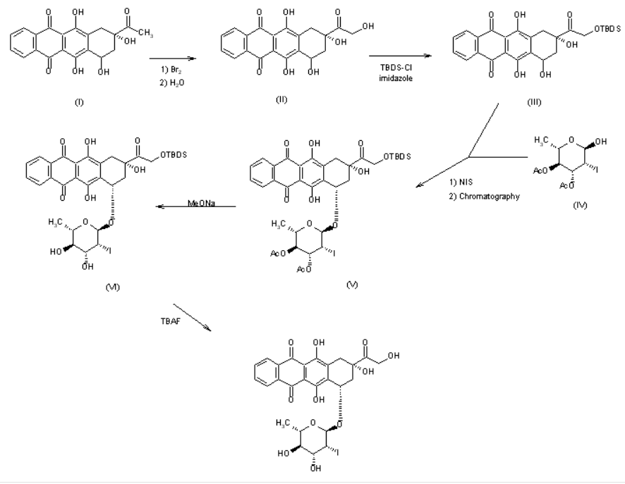 The reaction of racemic 4-demethoxydaunomycinone (I) with Br2 followed by hydrolysis in basic medium gives 4-demethoxyadriamycinone (II), which is treated with tert-butyldimethylsilyl chloride and imidazole in DMF to yield the monoprotected compound (III). The condensation of (III) with 3,4-di-O-acetyl-2,6-dideoxy-2-iodo-alpha-L-mannopyranose (IV) by means of N-iodosuccinimide (NIS), followed by chromatographic separation of the diastereomers affords (7S,9S)-14-O-(tert-butyldimethylsilyl)-4-demethoxy-7-O-(3,4-di-O-acetyl-2,6-dideoxy-2-iodo-alpha-L-mannopyranosyl)adriamycinone (V). The hydrolysis of (V) with sodium methoxide in methanol gives the silylated compound (VI), which is finally desilylated with tetrabutylammonium fluoride (TBAF) in dichloromethane/THF/pyridine.