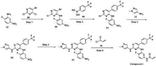 Synthesis of N-(4-fluoro-3-((2-((l-methyl-lH-pyrazol-4-yl)amino)-5-(4-(trifluoro methyl)phenyl)pyrimidin-4-yl)amino)phenyl)acrylamide (Compound I):