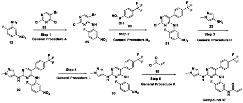 Scheme 21: Synthesis of N-(4-fluoro-3-((2-((1-methyl-1H-pyrazol-4-yl)amino)-5-(4-(trifluoromethyl)phenyl)pyrimidin-4-yl)amino)phenyl)acrylamide (Compound 37):