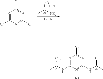 At 0° C., to a flask were added 1,4-dioxane (50 mL), 2,4,6-trichloro-1,3,5-triazine (1.84 g, 10 mmo), (R)-1,1,1-trifluoropropan-2-amine hydrochloride (2.99 g, 20 mmol) and DIEA (5.17 g, 40 mmol). The reaction was heated to 60° C. and stirred for 4 hours. After the reaction was completed, the mixture was condensed and purified by flash column chromatography (eluting with gradient water/MeOH=100:0-0:100) to give Intermediate I-3 as yellow solid (2.50 g, yield: 74%). MS (m/z): 338.0 [M+H] +