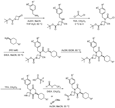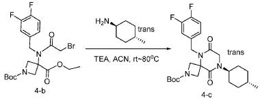 [0149] To a solution of 1-(tert-butyl) 3-ethyl 3-(2-bromo-N-(3,4-difluorobenzyl)acetamido)azetidine-1,3-dicarboxylate (8.0 g, 16.3 mmol, 1.0 equiv) in ACN (80 mL) were added TEA (4.9 g, 48.4 mmol, 3.0 equiv) and trans-(1r,4r)-4-methylcyclohexan-1-amine (2.8 g, 24.7 mmol, 1.5 equiv). The resulting mixture was stirred at rt for 1 h, gradually warmed to 80 ˚C, and stirred at 80 ˚C overnight. The mixture was cooled to rt, concentrated under reduced pressure, and triturated with a mixture of PE and EA (7/1; 80 mL) to afford 7 g (~80% purity) of tert-butyl 5-(3,4-difluorobenzyl)-8-((1r,4r)-4-methylcyclohexyl)-6,9-dioxo-2,5,8-triazaspiro[3.5]nonane-2-carboxylate as an off-white solid. LRMS (ES) m/z 422 (M+H-56).