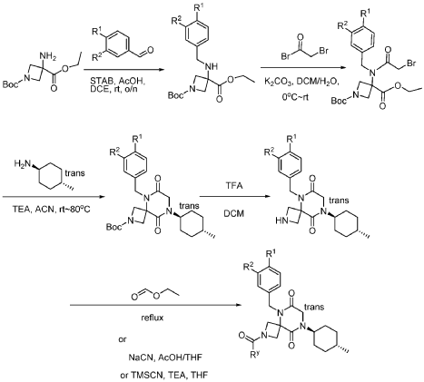 [0151] A solution of tert-butyl 5-(3,4-difluorobenzyl)-8-((1r,4r)-4-methylcyclohexyl)-6,9-dioxo-2,5,8-triazaspiro[3.5]nonane-2-carboxylate (1.5 g, 4.0 mmol, 1.0 equiv) in ethyl formate (15.0 mL) was stirred at 80