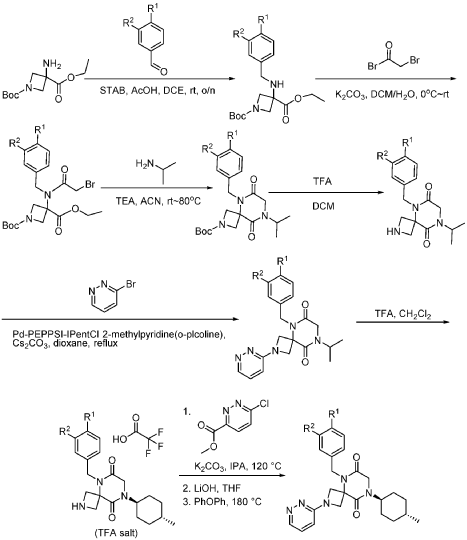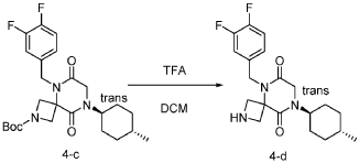 [0150] To a stirred solution of tert-butyl 5-(3,4-difluorobenzyl)-8-((1r,4r)-4-methylcyclohexyl)-6,9-dioxo-2,5,8-triazaspiro[3.5]nonane-2-carboxylate (7.0 g, 14.7 mmol, 1.0 equiv) in DCM (70.0 mL) was added TFA (18.0 mL). The resulting mixture was stirred at rt for 3h, diluted with water (100.0 mL), adjusted the pH to 13-14 with aqueous NaOH solution (2 N), and extracted with DCM (100 mL) twice. The combined organic layers were washed with brine (100.0 mL) twice, dried over anhydrous Na 2 SO 4 , and concentrated under reduced pressure to afford 4.5 g (~80% purity) of 5-(3,4-difluorobenzyl)-8-((1r,4r)-4-methylcyclohexyl)-2,5,8-triazaspiro[3.5]nonane-6,9-dione as a yellow semi-solid. LRMS (ES) m/z 378 (M+H).
