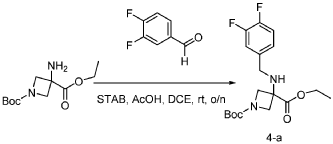 [0147] To a solution of 1-tert-butyl 3-ethyl 3-aminoazetidine-1,3-dicarboxylate (4.0 g, 16.4 mmol, 1.0 equiv) and 3,4-difluorobenzaldehyde (2.4 g, 19.6 mmol, 1.2 equiv) in DCE (40.0 mL) at 0 ˚C were added STAB (7.0 g, 32.8 mmol, 2.0 equiv) and AcOH (2.0 g, 32.8 mmol, 2.0 equiv). The resulting mixture was stirred at rt overnight, adjusted the pH to 8 with ammonium hydroxide, added water (50.0 mL) and extracted with DCM (50.0 mL) twice. The combined organic layers were washed with brine (50 mL) twice, dried over anhydrous Na 2 SO 4 , and concentrated under reduced pressure to afford 6.0 g of 1-tert-butyl 3-ethyl 3-(3,4-difluorobenzyl)amino)azetidine-1,3-dicarboxylate as a yellow oil. LRMS (ES) m/z 315 (M+H-56).