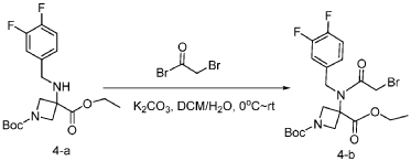 [0148] To a solution of 1-tert-butyl 3-ethyl 3-[[(3,4-difluorophenyl)methyl]amino]azetidine-1,3-dicarboxylate (6.0 g, 16.2 mmol, 1.0 equiv) in DCM (60.0 mL) at 0 ˚C were added a solution of K 2 CO 3 (3.4 g, 24.3 mmol, 1.50 equiv) in water (30 mL), and then bromoacetyl bromide (3.9 g, 19.4 mmol, 1.2 equiv) dropwise over a period of 10 min. The resulting mixture was stirred at rt overnight and extracted with DCM (50.0 mL) twice. The combined organic layers were washed with brine (100 mL) twice, dried over anhydrous Na 2 SO 4 , and concentrated under reduced pressure to afford 8.0 g of 1-(tert-butyl) 3-ethyl 3-(2-bromo-N-(3,4-difluorobenzyl)acetamido)azetidine-1,3-dicarboxylate as a yellow oil. LRMS (ES) m/z 435 (M+H-56).