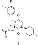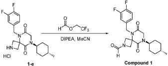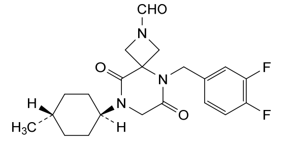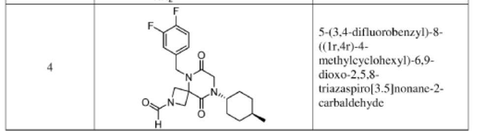 5-(3,4-difluorobenzyl)-8-((1r,4r)-4-methylcyclohexyl)-6,9-dioxo-2,5,8-triazaspiro[3.5]nonane-2-carbaldehyde, also called compound 1, having the structure shown below,