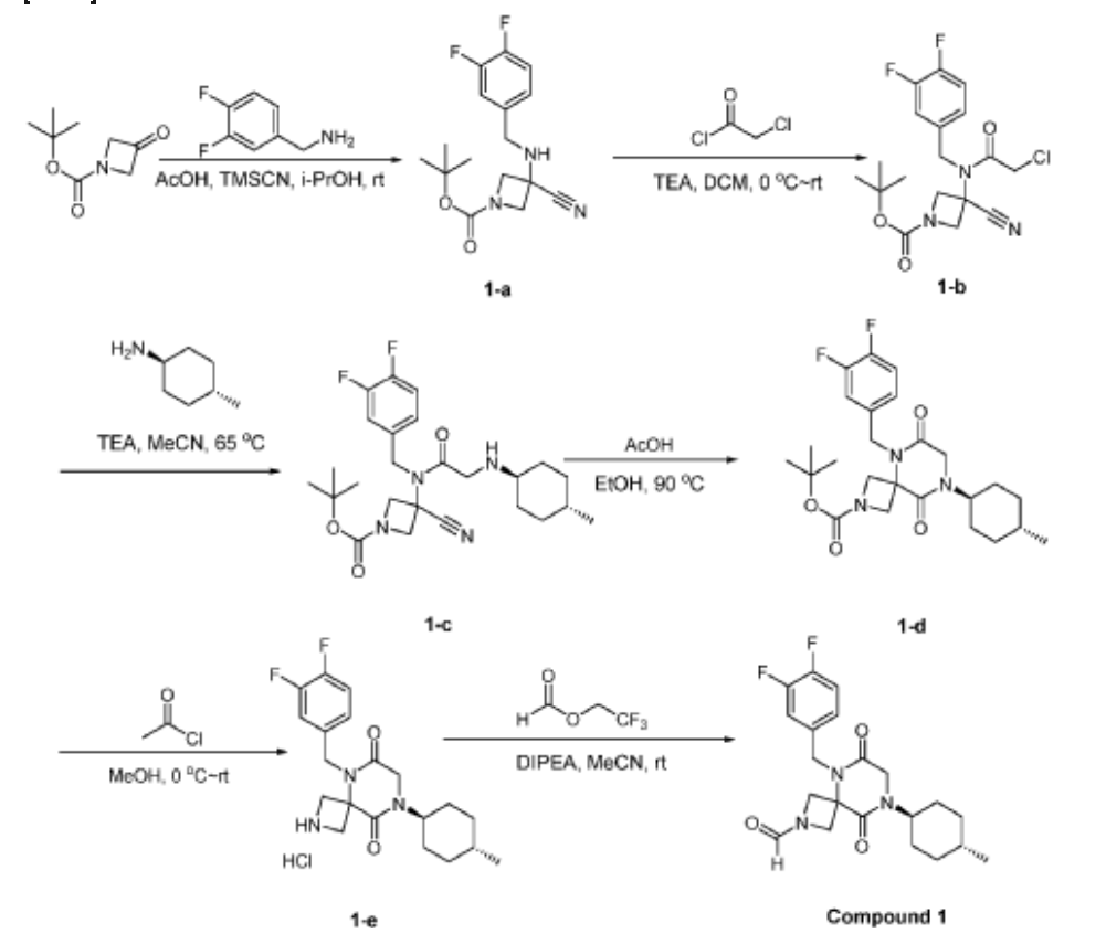 Synthesis of 5-(3,4-difluorobenzyl)-8-((1r,4r)-4-methylcyclohexyl)-6,9-dioxo-2,5,8-triazaspiro[3.5]nonane-2-carbaldehyde (Compound 1)