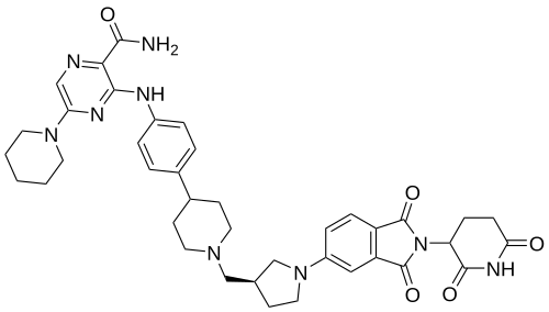 Zelebrudomide (NX-2127) is an investigational new drug that is being evaluated by Nurix Therapeutics for the treatment of relapsed or refractory B-cell malignancies such as chronic lymphocytic leukemia (CLL), mantle cell lymphoma (MCL), diffuse large B-cell lymphoma (DLBCL), and Waldenström macroglobulinemia (WM). It is an orally bioavailable proteolysis targeting chimera (PROTAC) designed to degrade Bruton’s tyrosine kinase (BTK) along with the immunomodulatory proteins Ikaros (IKZF1) and Aiolos (IKZF3).[1]