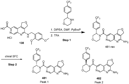 [0163] Examples 481 and 482: (4-amino-l,3-dihydrofuro[3,4-c][l,7]naphthyridin-8-yl)(3-(4- (trifluoromethyl)phenyl)morpholino)methanone