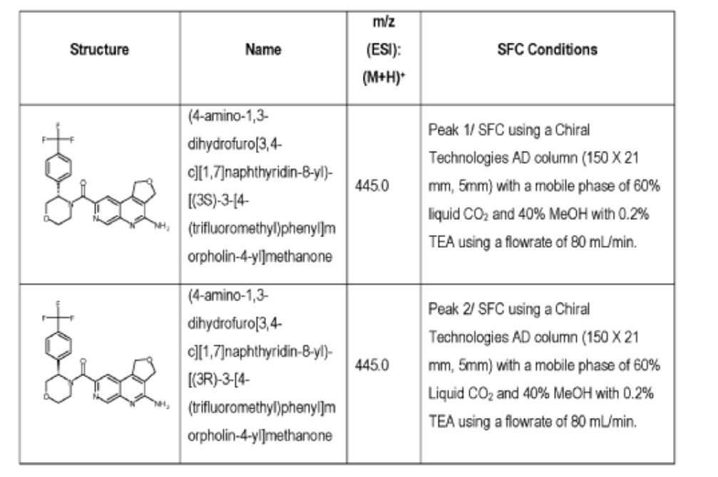 (4-amino-l,3-dihydrofuro[3,4-c][l,7]naphthyridin-8-yl)(3-(4-(trifluoromethyl)phenyl)morpholino)methanone 2,2,2-trifluoroacetate were separated via preparative SFC using a Chiral Technologies AD column (150 x 21 mm, 5mm) with a mobile phase of 60% Liquid CO2 and 40% MeOH with 0.2% TEA using a flowrate of 80 mL/min to generate peak 1, (S)-(4-amino-l,3-dihydrofuro[3,4-c][l,7]naphthyridin-8-yl)(3-(4-(trifluoromethyl)phenyl)morpholino)methanone with an ee of >99%, and peak 2, (R)-(4-amino-l,3-dihydrofuro[3,4-c][l,7]naphthyridin-8-yl)(3-(4-(trifluoromethyl)phenyl)morpholino)methanone with an ee of 99.28%. Peak assignment determined by