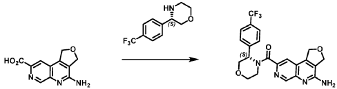 [0137] 4-Amino-1 ,3-dihydrofuro[3,4-c][1 ,7]naphthyridine-8-carboxylic acid (1.0 kg, 4.3 mol, 1.0 equiv), (3S)-3-[4-(trifluoromethyl)phenyl]morpholine (1.2 kg, 5.2 mmol, 1.2- equiv), and DMF, (6.6 kg, 7.0 V) were charged to a clean, dry reactor. To the mixture was added triethylamine (1.1 Kg, 13.8 mol, 2.6 equiv). The mixture was cooled to 10 ± 5 °C and O-(benzotriazol-1-yl)-N,N,N’,N’-tetramethyluronium tetrafluoroborate (TBTU) (1.67 kg, 5.2 mol, 1.2 equiv) was added slowly. Next, an additional amount of DMF (0.94 Kg, 1 V) was added. The reaction mixture was warmed to 25 ± 5 °C and stirred over 18 hours. Water (1 .0 kg, 1 V) was charged followed by MeCN (1 .6 kg, 2 V) and the reaction mass was warmed to 45 °C. Next, water (7.0 Kg, 7 V) was added over 30 min. A seed lot of 4-amino-1 ,3-dihydrofuro[3,4-c][1,7]naphthyridin-8-yl)-[(3S)-3-[4-(trifluoromethyl)phenyl]morpholin-4-yl]methanone (10 g, 22 mmol, 0.01 equiv), was charged and the mixture was stirred at 45 °C for over 2 hours before being cooled to 20 °C over 10 hours. Water (12.0 kg, 12 V) was added over 2 hours at 20 °C and further stirred for over 4 hours before being filtered. The reactor was rinsed with a mixture of 10% DMF in water (9.83 kg, 10 V) and the resulting rinse mixture was used to wash the cake. The reactor was rinsed with a mixture of water (10.0k kg, 10 V) and the resulting rinse mixture was used to wash the cake. This rinsing and washing protocol was repeated once more with water (10.0k kg, 10V). The cake was dried under vacuum with a stream of nitrogen to afford (4-amino-1 ,3-dihydrofuro[3,4-c][1 ,7]naphthyridin-8-yl)-[(3S)-3-[4-