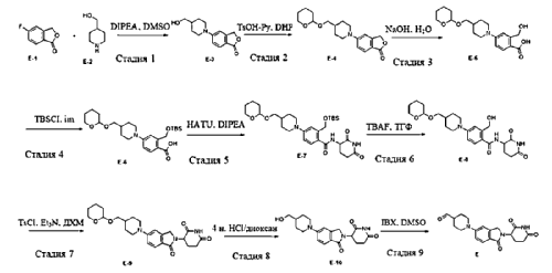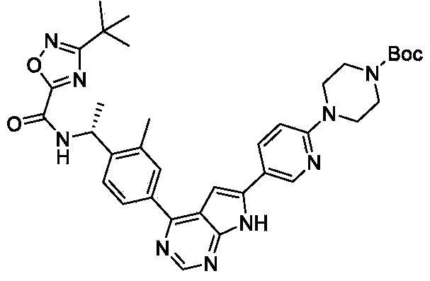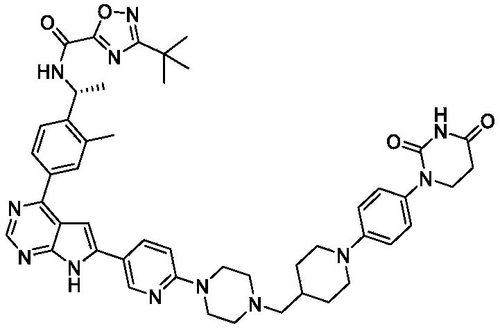 A mixture of (R) -3- (tert-butyl) -N- (1- (2-methyl-4- (6- (6- (piperazin-1-yl) pyridin-3-yl) -7H-pyrrolo [2, 3-d] pyrimidin-4-yl) phenyl) ethyl) -1, 2, 4-oxadiazole-5-carboxamide, hydrogen chloride salt (0.06 g, 0.1 mmol) , 1- (4- (2, 4-dioxotetrahydropyrimidin-1 (2H) -yl) phenyl) piperidine-4-carbaldehyde (0.033 g, 0.11 mmol) and NaOAc (8.2 mg, 0.1 mmol) in DCM/EtOH (30 mL/10 mL) was stirred in a round bottom flask for 1 h at 20 ℃. Then NaBH 3CN (12.6 mg, 0.2 mmol) was added. The mixture was stirred overnight at 20 ℃. The mixture was concentrated to dryness and purified with silica gel column chromatography (MeOH in DCM from 0%to 12%gradient elution) to give the product (0.049 g, 57.8%) . 1H NMR (400 MHz, DMSO) δ H12.60 (s, 1H) , 10.27 (s, 1H) , 9.97 (d, J =6.1 Hz, 1H) , 8.79 (d, J = 18.7 Hz, 2H) , 8.18 (d, J = 7.8 Hz, 1H) , 8.09 (d, J = 7.0 Hz, 1H) , 8.04 (s, 1H) , 7.67 (d, J = 7.7 Hz, 1H) , 7.30 (s, 1H) , 7.13 (d, J = 6.9 Hz, 2H) , 6.97-6.92 (m, 3H) , 5.41-5.34 (m, 1H) , 3.71-3.68 (m, 4H) , 3.64-3.56 (m, 4H) , 2.70-2.64 (m, 4H) , 2.53 (s, 3H) , 2.47-2.43 (m, 4H) , 2.25-2.19 (m, 2H) , 1.84-1.81 (m, 2H) , 1.75-1.70 (m, 1H) , 1.56 (t, J = 9.1 Hz, 3H) , 1.37 (s, 9H) , 1.28-1.18 (m, 2H) .