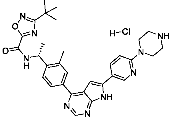 To a solution of tert-butyl (R) -4- (5- (4- (4- (1- (3- (tert-butyl) -1, 2, 4-oxadiazole-5-carboxamido) ethyl) -3-methylphenyl) -7H-pyrrolo [2, 3-d] pyrimidin-6-yl) pyridin-2-yl) piperazine-1-carboxylate (1.02 g, 1.53 mmol) in DCM (50 mL) in a round bottom flask was added HCl in dioxane (4 N, 35 mL) at 0 ℃. The mixture was stirred for 2 h at 20 ℃. The precipitate was collected with filtration and dried in vacuum to afford the product (0.92 g, 100%) . 1H NMR (400 MHz, DMSO) δ H13.53 (s, 1H) , 10.06 (d, J = 7.5 Hz, 1H) , 9.33 (s, 2H) , 9.00 (s, 1H) , 8.93 (s, 1H) , 8.35 (d, J = 8.7 Hz, 1H) , 8.05 (d, J = 8.1 Hz, 1H) , 7.99 (s, 1H) , 7.75 (d, J = 8.0 Hz, 1H) , 7.55 (s, 1H) , 7.12 (d, J = 8.9 Hz, 1H) , 5.50-5.28 (m, 1H) , 3.89 (s, 4H) , 3.20 (s, 4H) , 2.57 (s, 3H) , 1.56 (d, J = 6.9 Hz, 3H) , 1.38 (s, 9H) . [M+H] += 566.3.