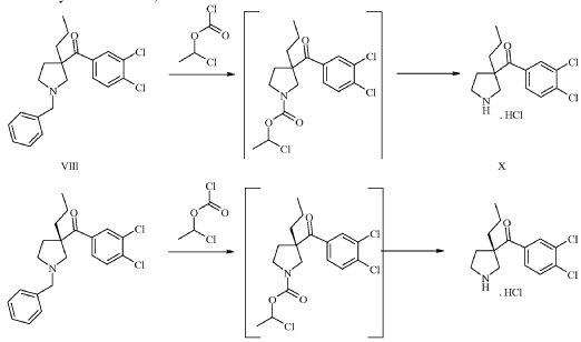 0123-(l-benzyl-3-propylpyrrolidin-3-yl)(3,4-dichlorophenyl)methanone (IX-1) (5 g, 13.3 mmol, Eq: 1.00, see U.S. Patent No. 9,527,810 for synthesis) was dissolved in dichloromethane (30 mL). The light yellow solution was cooled to 0-5 °C and N-ethyldiisopropylamine (172 mg, 226 pL, 1.33 mmol, Eq: 0.1) was added. 1-Chloroethyl chloroformate (2.28 g, 1.74 ml, 15.9 mmol, Eq: 1.2) was added dropwise while the temperature was maintained in between 0-5 °C. The reaction was warmed to room temperature over 30 min and was stirred 1 h at room temperature. Methanol (25 mL) was added and the light yellow solution was heated to 40 °C for 40 min. The reaction mixture was concentrated under reduced pressure (40 °C, 600-15 mbar) to give 5.48 g of crude product. Ethyl acetate (30.0 mL) was added and the suspension was heated to 50 °C. A solution of water (239 mg, 239 pL, 13.3 mmol, Eq: 1.0) in ethyl acetate (35 mL) was added over 10 min. The white suspension was stirred for 1 h at 50 °C and cooled to room temperature over 1.5 h. The suspension was filtered, and the filter cake was washed twice with ethyl acetate (10 mL) and dried under reduced pressure (40° C, 15 mbar) to give 4.02 g of (15) as quarterhydrate (93% yield).