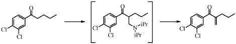 l-(3,4-dichlorophenyl)pentan-l-one II (15 g, 63.0 mmol, equivalents: 1.00) and paraformaldehyde (3.58 g, 113 mmol, equivalents 1.8) were charged in the reactor followed by heptane (20.5 g, 30.0 ml). Temperature was set to 25°C. Acetic acid (11.4 g, 10.9 ml, 189 mmol, equivalents: 3) was added followed by diethylamine (8.84 g, 12.5 ml, 120 mmol, equivalents: 1.9). The reaction mixture was heated to 60°C. After 17h30 reaction (< 2% starting material), deionized water (30.0 ml) was added and the reaction mixture was heated to 80°C. After completion of the reaction (usually < 5h; < 1% intermediate by HPLC), the reaction mixture was cooled to room temperature and polish filtered. The aqueous phase was separated and discarded. The organic phase was washed twice with 20 mL deionized water and once with 10 mL 25% aqueous sodium chloride. The organic phase was concentrated under reduced pressure and dried azeotropically with heptane to give 15.53 g of the desired product IV as orange oil (99% yield, corrected for 97.7 %).