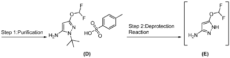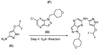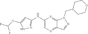 A mixture of 6-chloro-1-((tetrahydro-2H-pyran-4-yl)methyl)-1H-pyrazolo[3,4-b]pyrazine (Preparation 87, 780 mg, 3.09 mmol), 5-(difluoromethoxy)-1H-pyrazol-3-amine (554 mg, 3.72 mmol), tBuXphos Pd G3 (150 mg, 0.19 mmol) and KOAc (892 mg, 9.08 mmol) in dioxane (15 mL) was stirred at 90° C. for 6 h under N 2. The reaction mixture was evaporated to dryness in vacuo and the residue was purified by prep-HPLC-4 to afford the title compound as a white solid (361.4 mg, 32%). LCMS m/z=366 [M+H] +; 1H NMR (400 MHz, DMSO-d 6) δ: 12.21 (s, 1H), 10.82 (s, 1H), 8.19 (s, 1H), 8.17 (s, 1H), 7.32 (t, 1H), 5.98 (d, 1H), 4.40 (d, 2H), 3.87-3.75 (m, 2H), 3.29-3.16 (m, 2H), 2.24-2.11 (m, 1H), 1.46-1.29 (m, 4H).